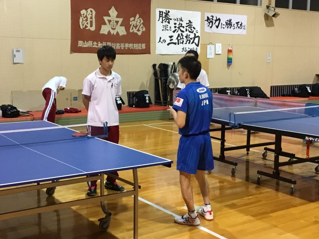 講演後は卓球部の練習に参加していただき、一人ひとりに大変丁寧なアドバイスを、そして18時まで試合練習をつけていただきました。その技術力の高さと人柄に部員は皆井上選手のファンになったようです。