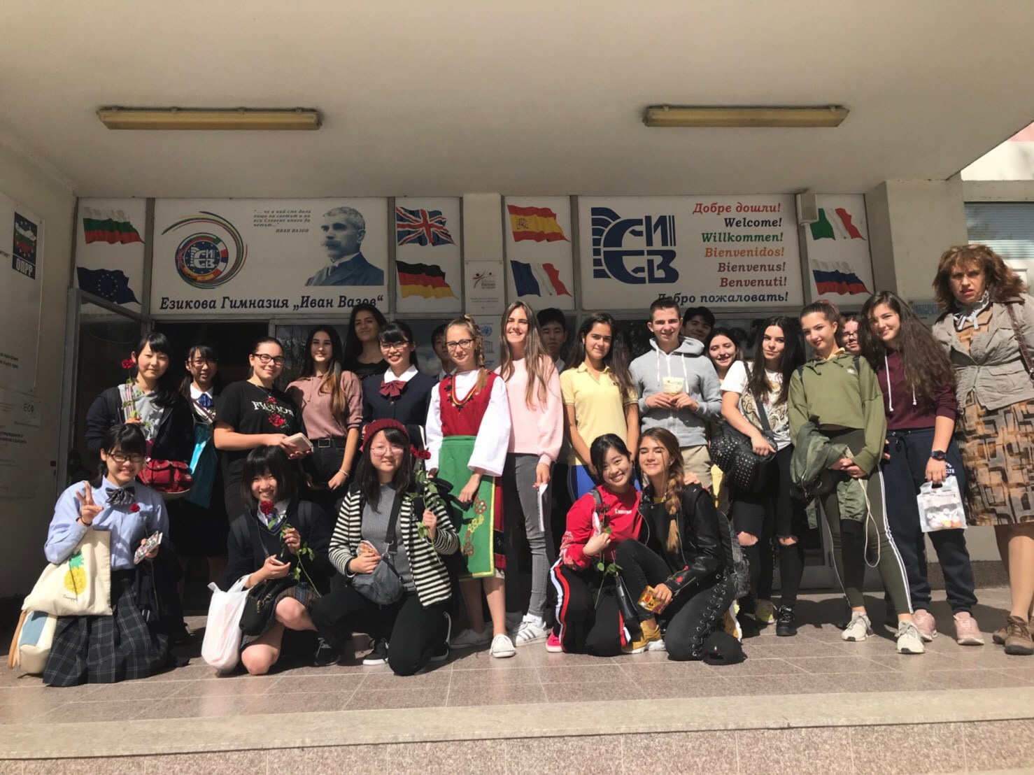 午前中は、2校目の訪問校Ivan Vazov Secondary Language Schoolを訪問しました。学校へ入る際、民族衣装を着た生徒さんがパンを持って迎えてくださいました。これは、自分の家で焼いたパンを来客者に振る舞うこの地方の伝統で、お好みで塩や蜂蜜を付けていただきました。次に伝統舞踊を見せてくださり、私たちも一緒に踊りました。