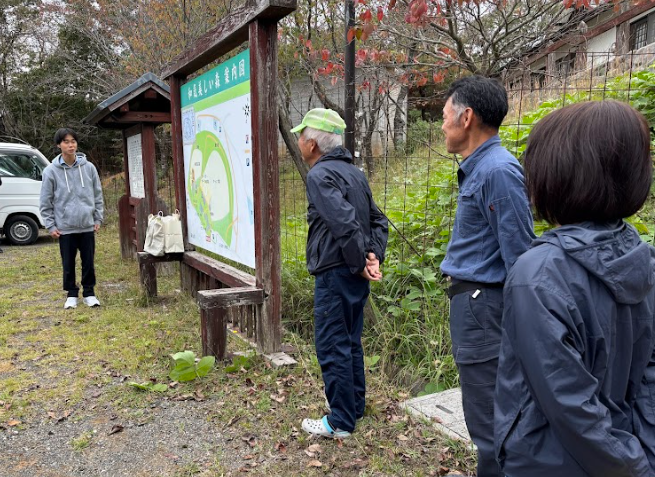 天神山散策:職員の方の安全な誘導のもと山に登り、山頂から吉井川や田土(たど)の美しい棚田の風景を眺めることができました。